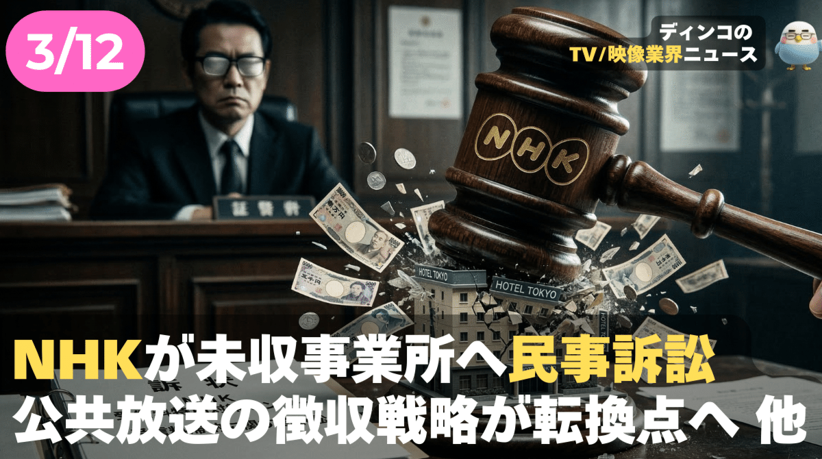 ディンコ・チャンネル 【NEWS 3月12日】NHKが未収事業所へ民事訴訟 公共放送の徴収戦略が転換点へ 他 話題のポイントは音声で!、(AI音声のため、読み上げに誤りが生じることがあります。あらかじめご了承ください。音声だけのPodcastリンクは最後に! ) 続きをみる