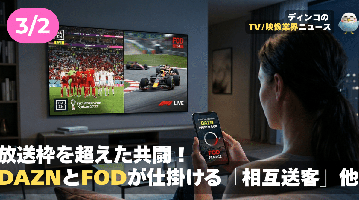 ディンコ・チャンネル 【NEWS 3月2日】放送枠を超えた共闘!DAZNとFODが仕掛ける「相互送客」他 話題のポイントは動画で!、(AI音声のため、読み上げに誤りが生じることがあります。あらかじめご了承ください。音声だけのPodcastリンクは最後に! ) 続きをみる