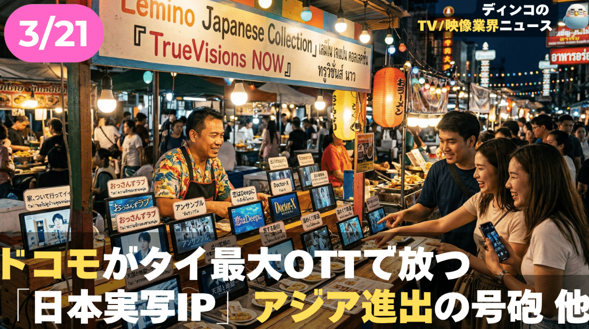 ディンコ・チャンネル 【NEWS 3月21日】ドコモがタイ最大OTTで放つ「日本実写IP」アジア進出の号砲 他 話題のポイントは音声で!、(AI音声のため、読み上げに誤りが生じることがあります。あらかじめご了承ください。音声だけのPodcastリンクは最後に! ) 続きをみる